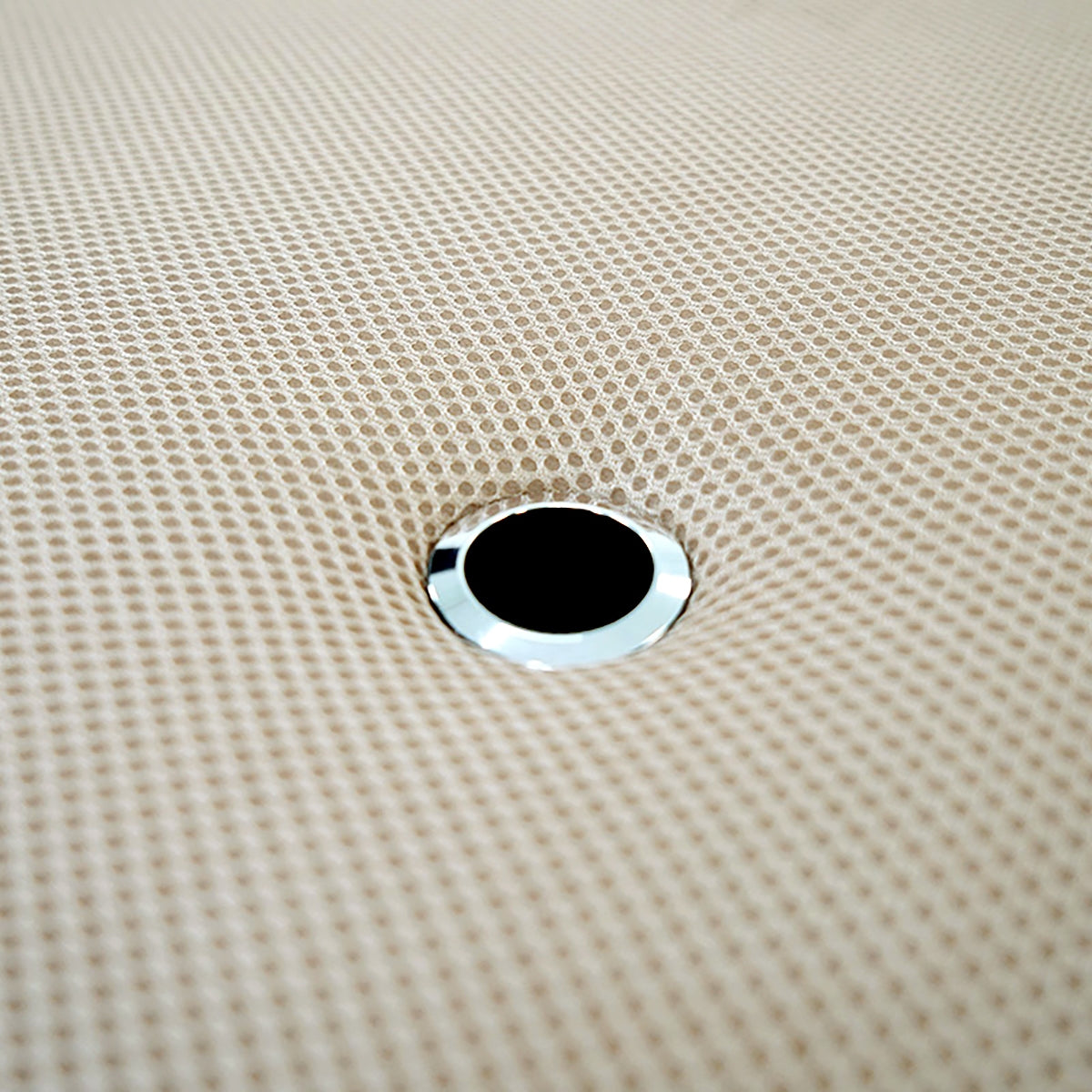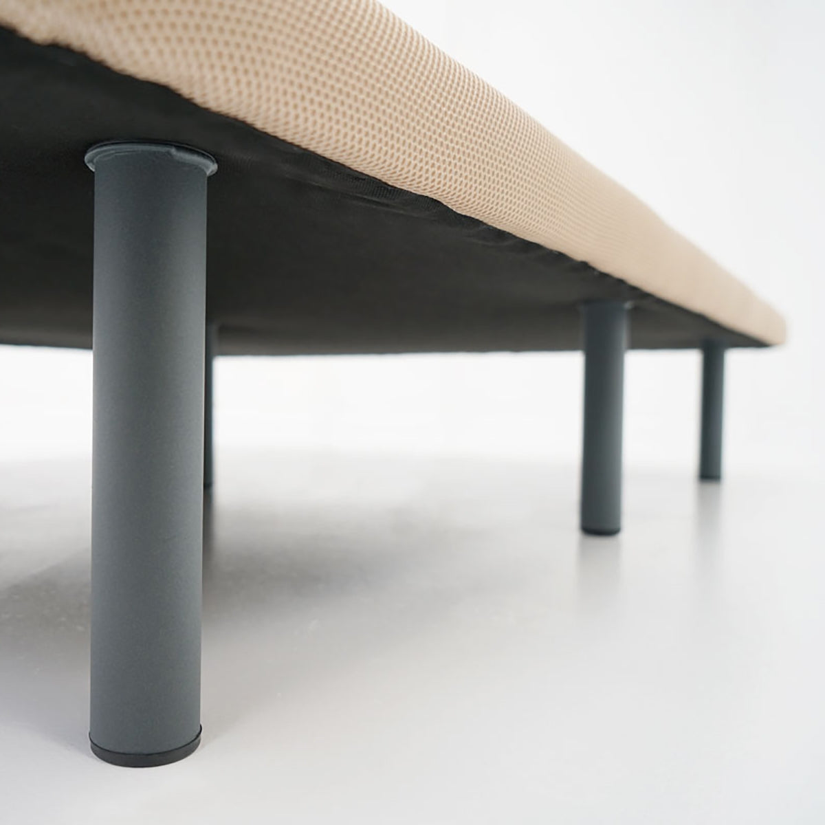 Bastidor metálico de 40x30 cm tapizado en tejido Air Fresh 3D, con alta trans - piración. Cuenta con base rígida y 6 pletinas de rosca para las patas (7 en tamaños mayores a 135 cm). Incluye 5 barras transversales soldadas y tablero de aglomerado de 10 mm con 4 aireadores AIRFLOW®